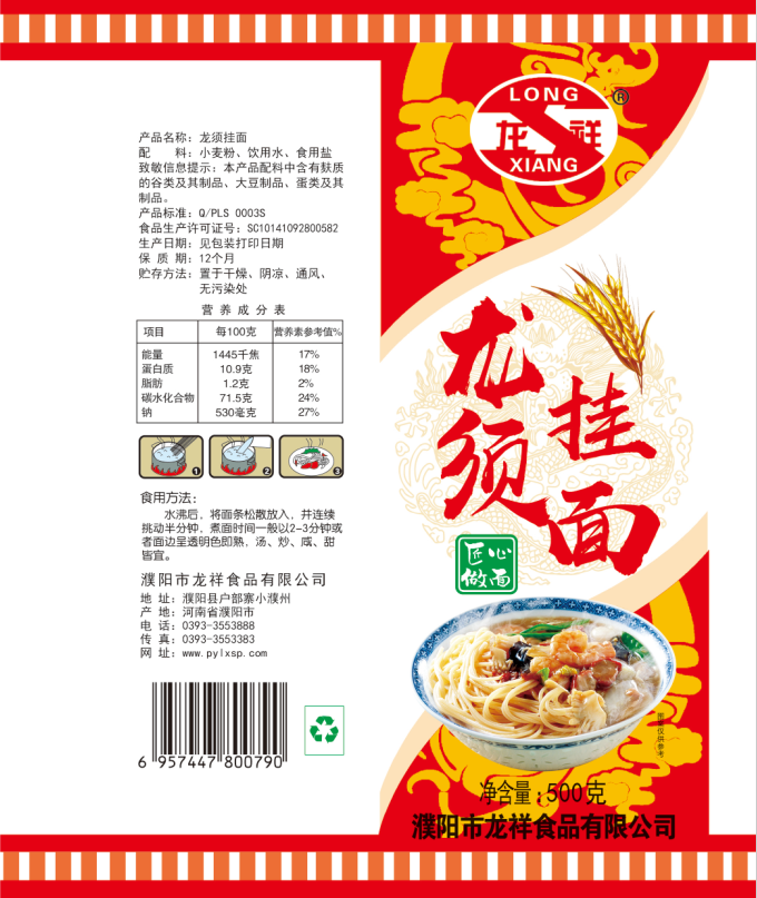 濮陽市龍祥食品有限公司位于河南省濮陽縣戶部寨鎮(zhèn)小濮州,始建于1994年,前期投資200萬元,經(jīng)過幾年的努力,大力開發(fā)市場(chǎng),由于市場(chǎng)的需求量急劇上升,出現(xiàn)供不應(yīng)求,于2004年擴(kuò)建,建成一座新型的現(xiàn)代化面粉加工企業(yè),并擁有全國先進(jìn)全自動(dòng)生產(chǎn)設(shè)備一套,產(chǎn)量由以前的100噸/天,提高到現(xiàn)在400噸/天。 2012年再次擴(kuò)大規(guī)模申請(qǐng)為濮陽市龍祥食品有限公司,注冊(cè)資金500萬元。2012年又投資800萬元新建掛面生產(chǎn)線一條,日產(chǎn)掛面50噸。龍祥食品有限公司現(xiàn)有職工120余人,總工程師1人,專業(yè)技術(shù)人員10人,經(jīng)濟(jì)師1人,會(huì)計(jì)師1人,銷售人員2人,優(yōu)秀專業(yè)人員20余人。  龍祥公司自創(chuàng)建以來,社會(huì)效益十分可觀。公司一直以“今天的質(zhì)量,明天的市場(chǎng)”為信念,“一切為了客戶需求,竭誠追求完美品質(zhì)”為企業(yè)宗旨,走專業(yè)化經(jīng)營和職業(yè)化管理的路子。